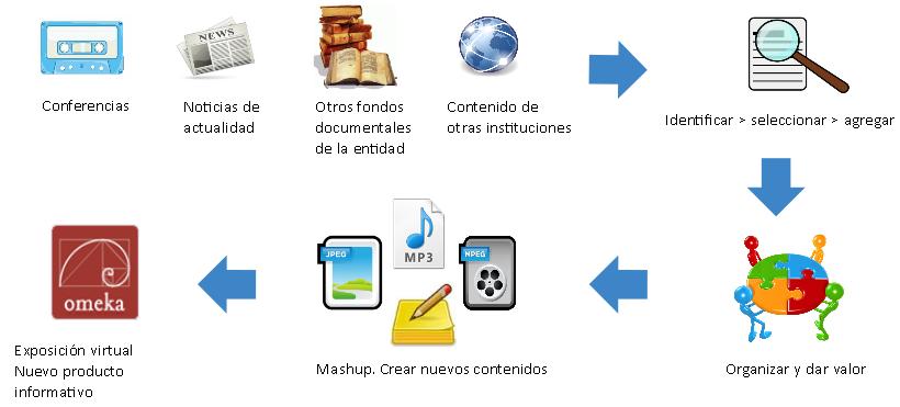 Aunque de momento no se ha implementado esta faceta comunicativa del repositorio a través de nuevos productos en forma de mashups, capaces de combinar las objetos del repositorio, otros objetos digitales de la entidad, fuentes externas y comentarios de expertos, para dar lugar a un nuevo producto en forma de exposición virtual, se prevé una futura incorporación al proyecto de esta metodología de trabajo.