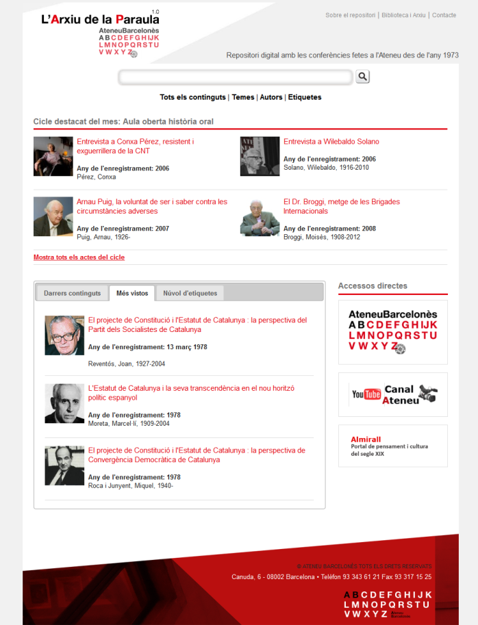 El pasado miércoles 16 de octubre presentamos en el Ateneu Barcelonès, la primera versión estable de L’Arxiu de la Paraula (El Archivo de la Palabra). Un repositorio resultado de la digitalización del material sonoro generado por el Ateneu Barcelonès desde 1973 hasta la actualidad.