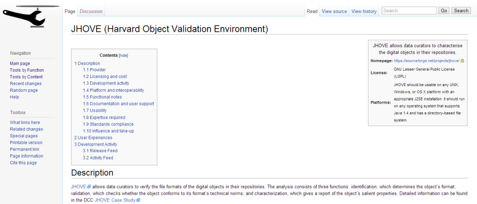 El directorio, construido con la plataforma MediaWiki, permite acceder a las entradas de cada herramienta por su nombre, función (auditoría, backup, validacion, etc.) y tipo de contenido (audio, vídeo, imagen, etc.). Las tres opciones resultan interesantes. La primera, para aquellos que desean saber más sobre una herramienta en concreto (known item search), la segunda para aquellos que necesitan encontrar una aplicación para una determina función o proceso, y por último, la tercera, para aquellos que desean localizar las herramientas relacionadas con el tipo de contenido que necesitan preservar.